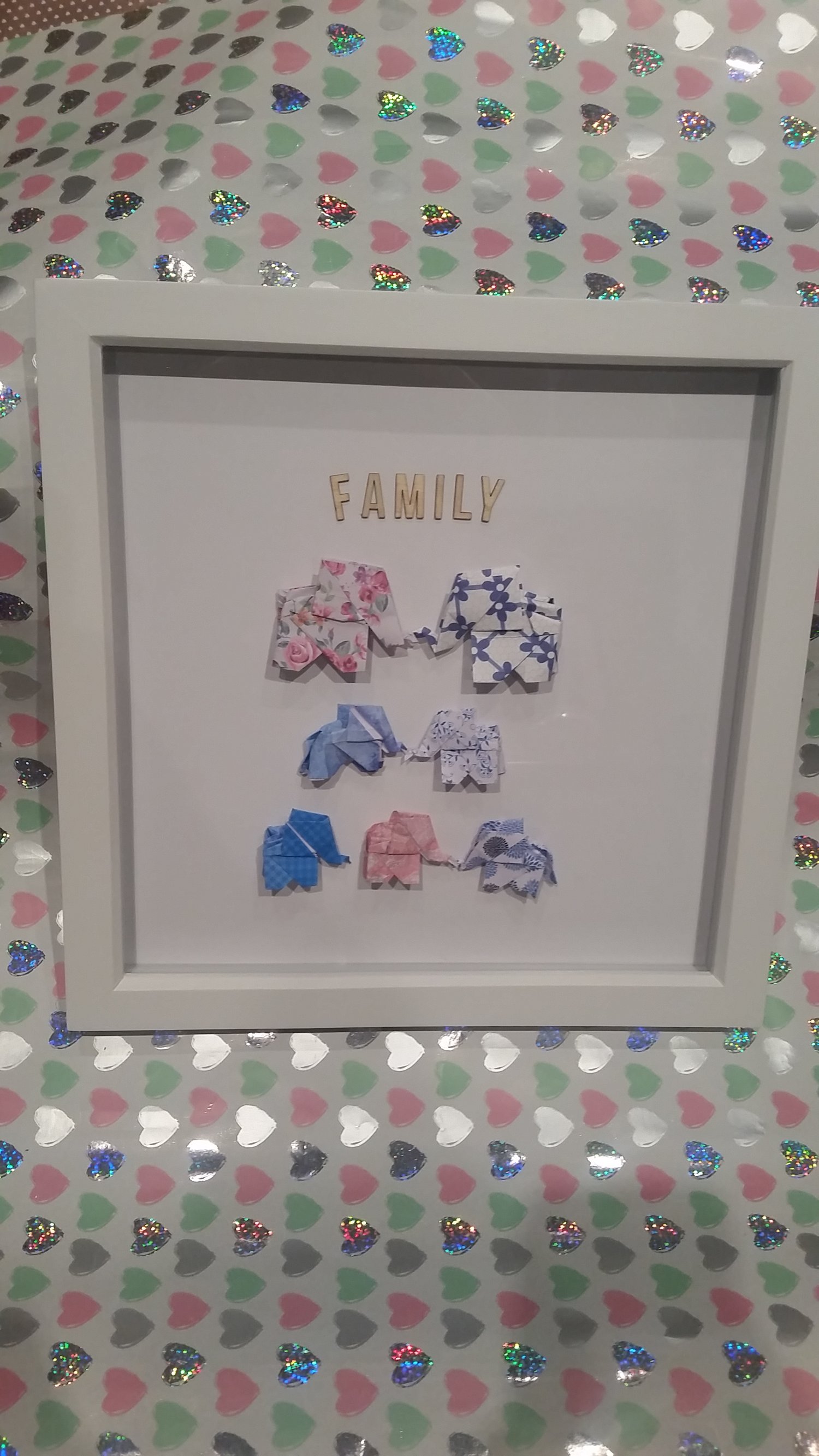 Individually handmade origami elephants in a box frame. All elephants in this version are origami as opposed to the smaller version we do.